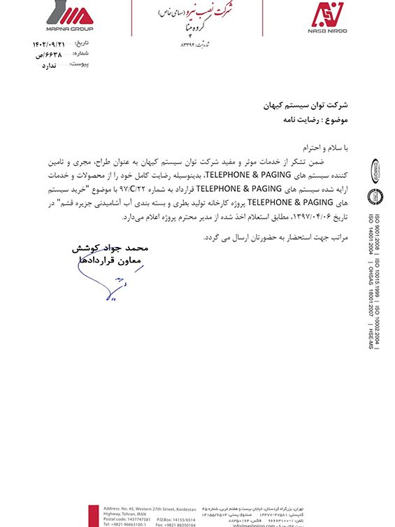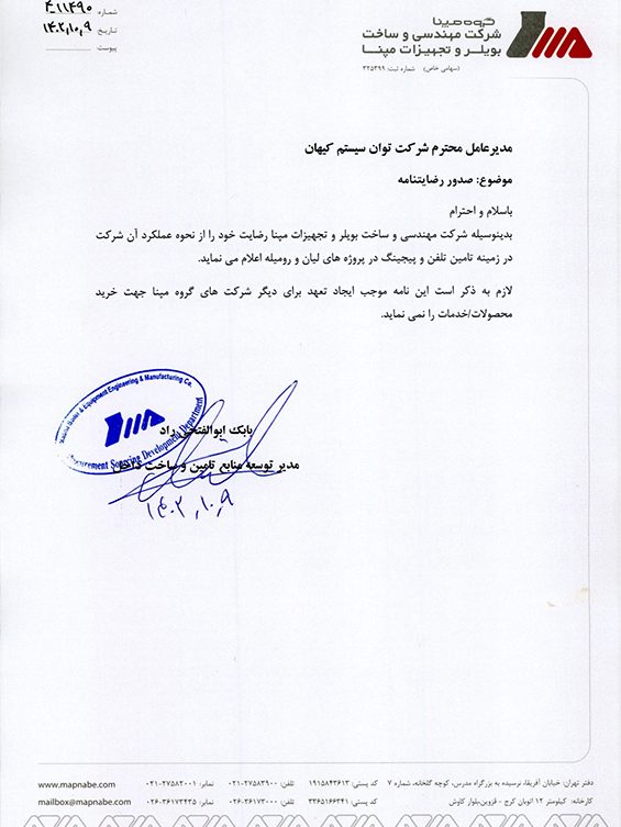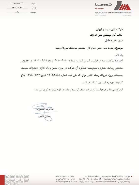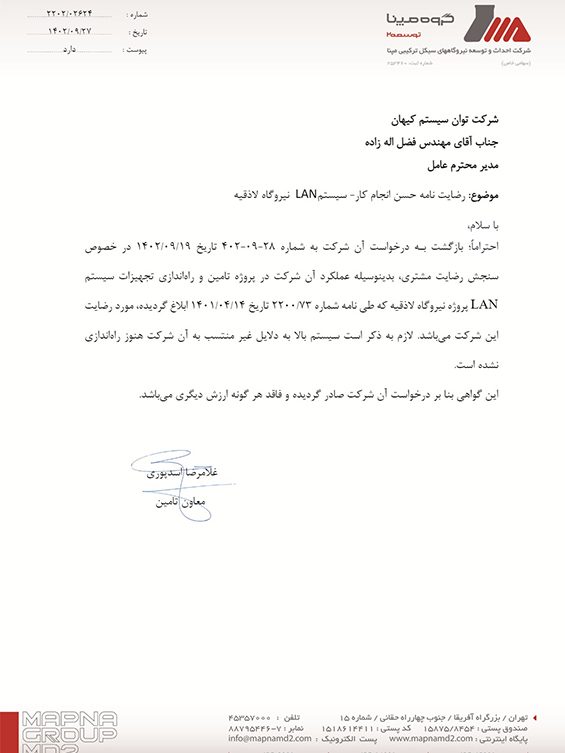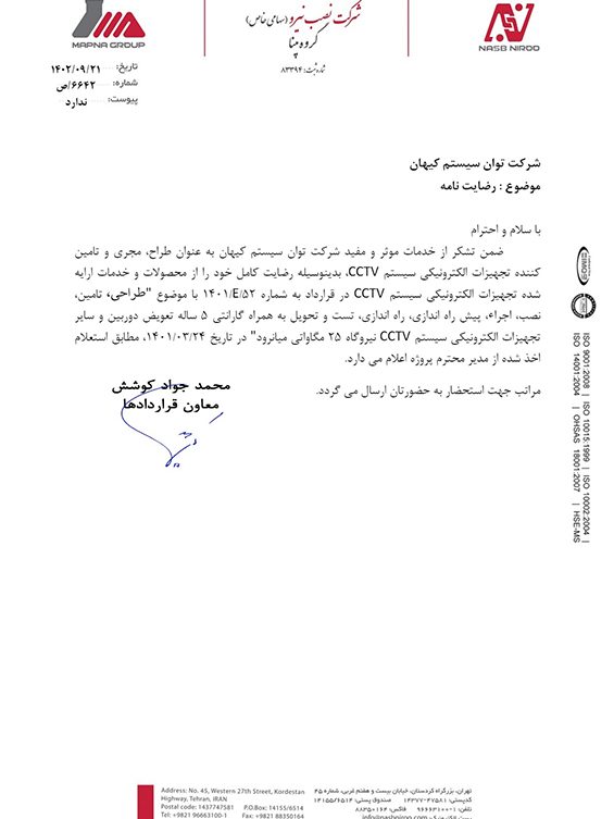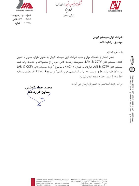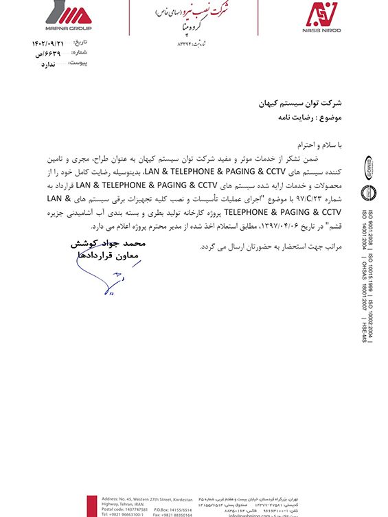 با بهره مندی از تیم های متخصص در بخش های مختلف و شعار” مشتری شریک ما است” همواره سعی در تامین رضایت مشتریان خود داشته ایم و کارفرمایانی که خدمات این شرکت در زمینه ارایه خدمات اجرایی و تهیه تجهیزات را تجربه کرده اند با ارایه رضایت نامه خوشنودی خود را اعلام داشته اند.